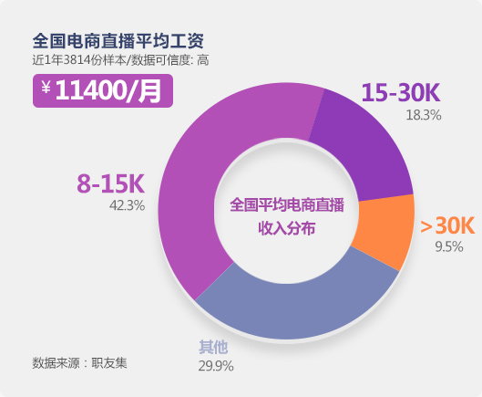 據(jù)數(shù)據(jù)統(tǒng)計(jì),中國(guó)電商直播從業(yè)者平均月工資收入在8~15k的居多,占比為42.3%;收入在15~30k的主播占比為18.3%,而收入在30k以上的主播僅占9.5%,部分主播收入較高。