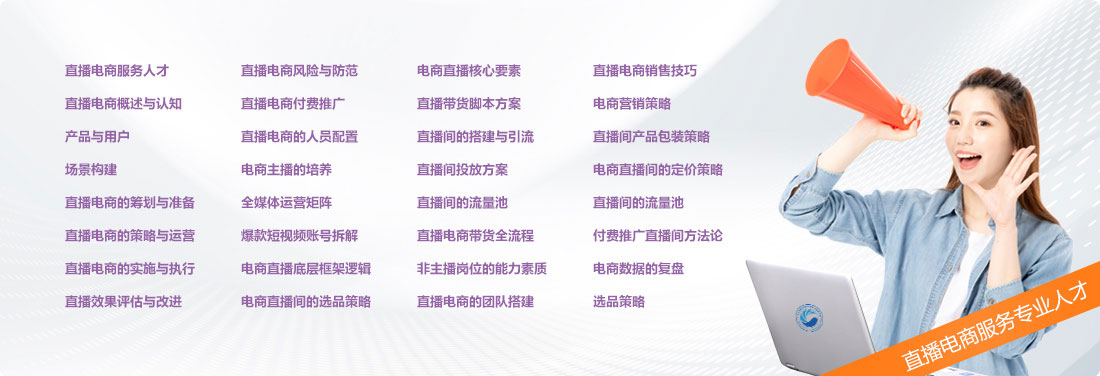直播電商服務(wù)專業(yè)培養(yǎng)學(xué)員掌握現(xiàn)代互聯(lián)網(wǎng)技術(shù)、消費(fèi)心理、網(wǎng)絡(luò)直播策劃等基本知識(shí),提升直播內(nèi)容策劃、直播文案撰寫、電商選品、網(wǎng)絡(luò)直播運(yùn)營(yíng)、客戶服務(wù)、網(wǎng)絡(luò)直播等專業(yè)能力。通過電商實(shí)訓(xùn)課程的學(xué)習(xí),積累行業(yè)經(jīng)驗(yàn),熟練掌握在淘寶,微信,抖音等各大直播平臺(tái)開展電商直播的策劃、技術(shù)、主播等專業(yè)技能,最終成長(zhǎng)為“懂營(yíng)銷,會(huì)技術(shù)”的復(fù)合型人才。具體研究方向如下:直播電商理論、直播電商的籌劃、直播電商的運(yùn)作、直播電商的實(shí)施、直播電商的評(píng)估和直播電商的風(fēng)險(xiǎn)與防范。
